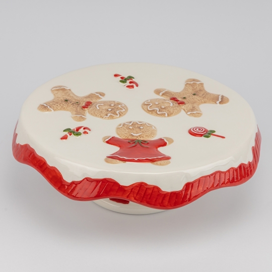 Керамічна підставка для торта з яскравим новорічним дизайном — прикрашена веселими пряниками на червоному тлі. Ідеально підходить для святкової подачі десертів, тортів або фруктів. Стане гарним доповненням до сервірування столу та створить теплу, святкову атмосферу у вашому домі.